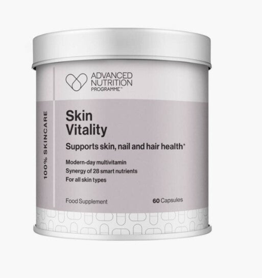 Onze huid maakt 200 miljoen huidcellen per uur aan, dus het is essentieel om ons grootste orgaan te voeden met voedingsstoffen. Innovaties en wetenschappelijke vooruitgang in supplementtechnologie inspireerden het team van Advanced Nutrition Programme™ om de nieuwe, verbeterde SKIN VITALITY te introduceren. Deze dagelijkse, essentiële vitamine voor de huid ondersteunt een drukke en veeleisende levensstijl met een uitgebreide voedingsstoffensynergie om te voldoen aan de vele moderne voedingsbehoeften.